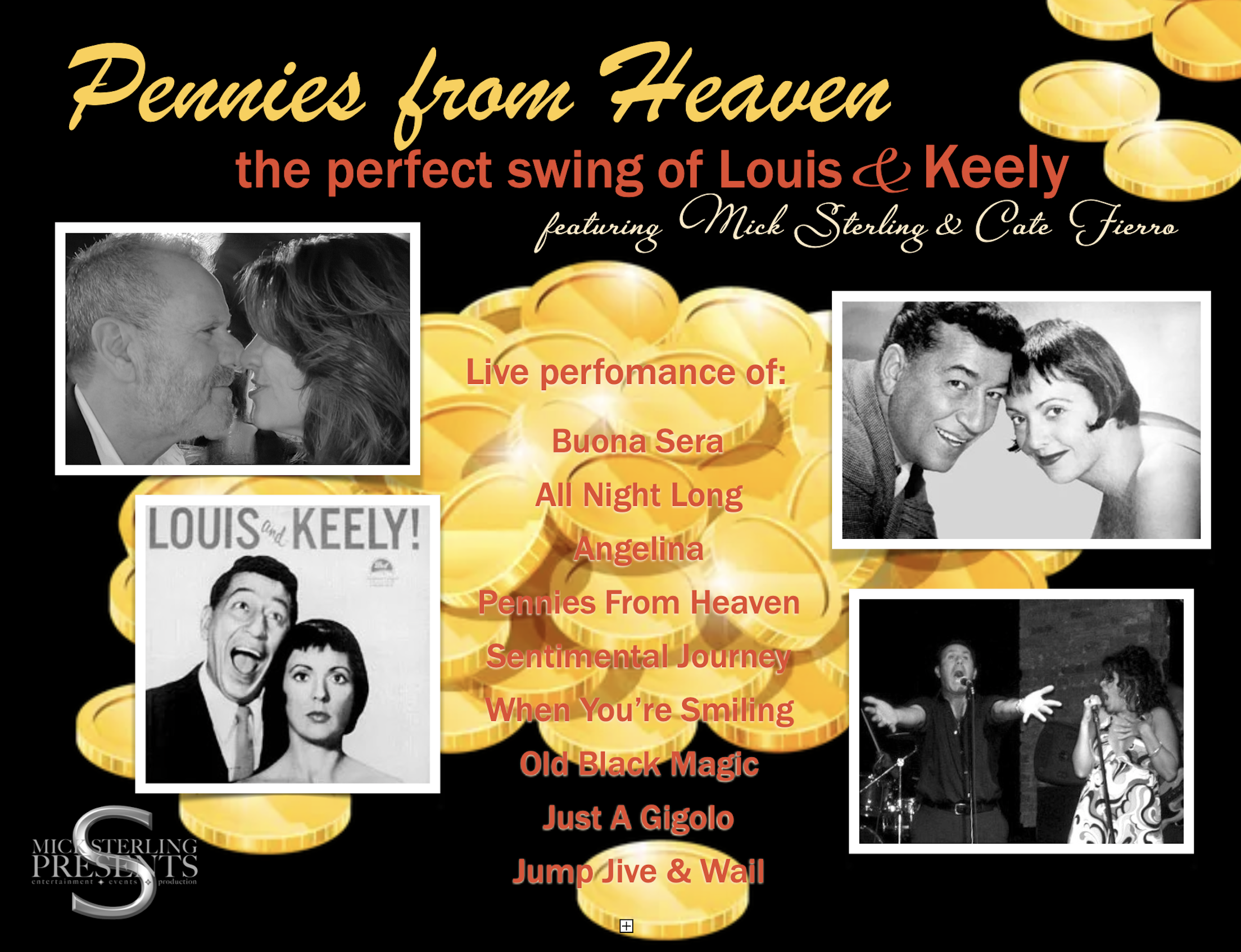 Mick Sterling and Cate Fierro take on the legendary and influential songs of Louis Prima and Keely Smith in a show that honors legendary Vegas and in many ways, the songs that began Rock and Roll! Backed by a band of Twin Cities giants, if you've never seen Louis and Keely in concert, we guarantee you that you've never seen a show like this in your life. Songs like JUST A GIGOLO, BUONA SERA, PENNIES FROM HEAVEN, JUMP AND JIVE and many more, PENNIES FROM HEAVEN will lift your spirits in ways you can't imagine.